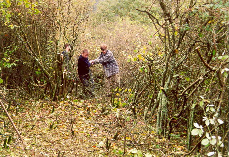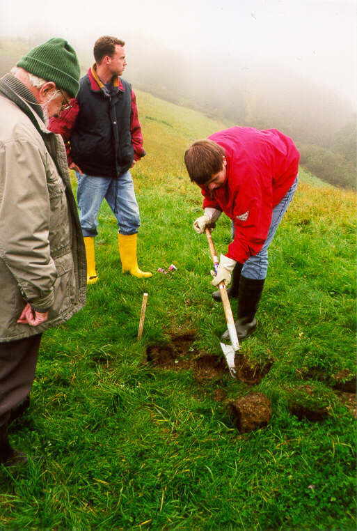 Herr Dr. Treinen bot uns die Hilfe seines Vermessungsbüros an. Die nötigen Helfer zum Graben kamen vom Gymnasium Konz. Albert Schmitt hatte seinen Leistungskurs Physik im Rahmen eines Projekts motiviert, etwas über die Landvermessung in der Praxis zu lernen. Nur der Erfahrung von Dr. Treinen war es zu verdanken, dass nach drei Tagen schließlich ein Grenzstein gefunden wurde. Das Gelände war bei einer Flurbereinigung um 1900 zum letzten Mal vermessen worden. Für den Landvermesser waren die Schwierigkeiten keine Überraschung, für uns um so mehr. Mit einer großzügigen Spende bewahrte uns Dr. Treinen vor dem ersten Finanzierungsproblem, das uns beinahe schon vor der Bauplanung in Schwierigkeiten gebracht hätte.