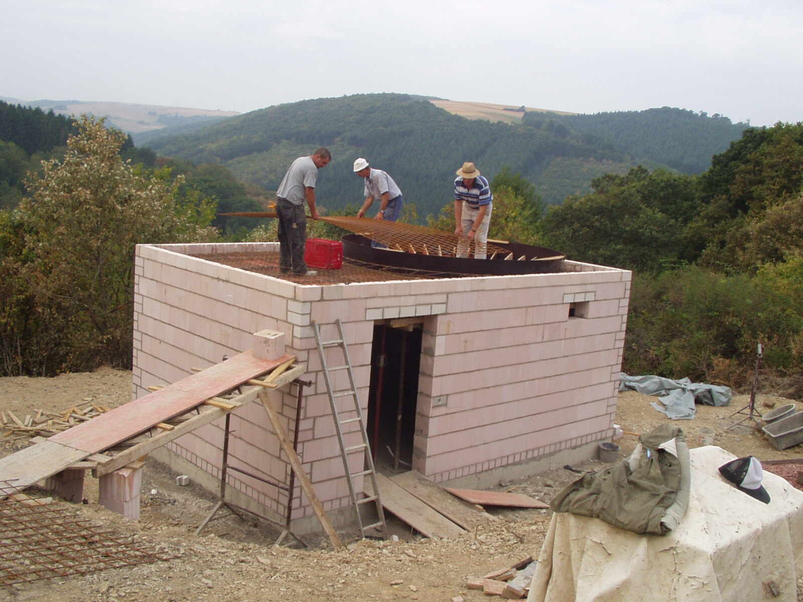 Die Angebote der Bauunternehmer zeigten, dass die schon erwähnte Firma Klein solide und günstig anbot. In der heißen Phase dieses Sommers wurde gebaut. Die Wetterbedingungen waren in Grenzen ein Glücksfall, allerdings nur in Grenzen: Das Grundstück war den ganzen Sommer über auch für Baufahrzeuge leicht erreichbar - ein entscheidender Vorteil. Dagegen mussten der Beton und das Mauerwerk mit Folien vor zu schneller Austrocknung bewahrt werden, was in unserem Klima nicht sehr oft vorkommt.