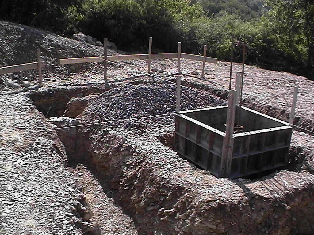 Die Gräben für die Fundamente sind ausgehoben., In der Mitte sieht man die Schalung für das Fundament des Fernrohrs.