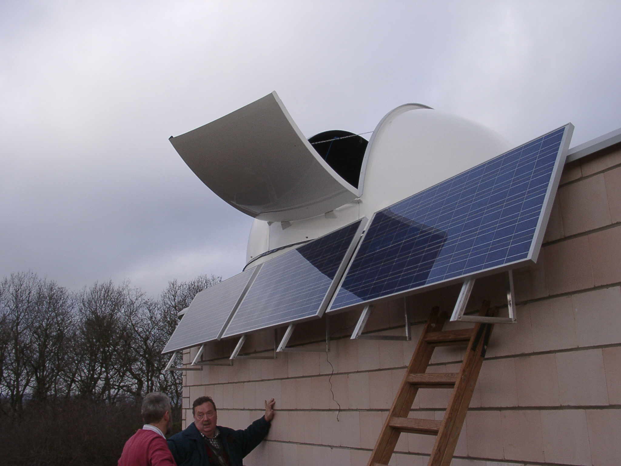 Dauerhaft mit einem motorgetriebenen Aggregat zu arbeiten verbot sich in einem Landschaftsschutzgebiet von selbst. Mit einem Windrad hätte man sich den freien Blick für das Fernrohr beeinträchtigt. Fotovoltaik sollte die Lösung sein.