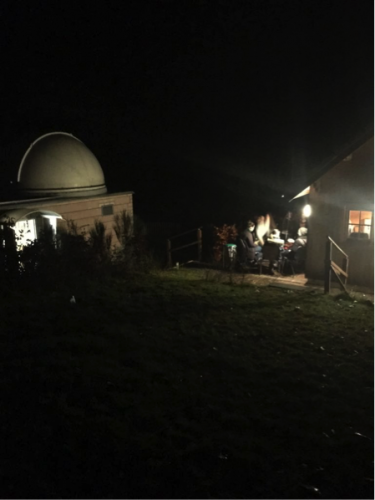 Nach dieser Anstrengung stärkten wir uns beim gemeinsamen Grillen. Lange warteten wir bei eisigen Temperaturen auf größere Wolkenlücken. Währenddessen erklärten uns die Vertreter der Sternwarte einige Grundlagen, die zum Beobachten der Himmelsobjekte wichtig sind. Vor allem die Funktionsweise des Teleskops, sowie die Akustik in der Kuppel beeindruckten uns.  Als die Wolken für kurze Zeit verschwanden, nutzten wir die Gelegenheit mithilfe einer Langzeitbeleuchtung ein Bild des Andromeda-Nebels zu schießen. Zu unser aller Staunen ist dieses sehr gut gelungen, Dank richtiger Einstellung der Kuppel, die manuell um 360° gedreht werden kann. Jeder von uns durfte einen Blick durch das Teleskop werfen und wir konnten so auch andere Sterne und Sternenbilder beobachten, bis sich die Wolkendecke wieder verdichtete. Die Kälte in der Kuppel machte uns schwer zu schaffen, weshalb wir uns schon bald wieder in die warme Holzhütte begeben mussten, in der wir bereits unser Nachtlager errichtet hatten. Wir fielen allesamt froh und angefüllt mit einer Fülle neuer Impressionen sofort in himmlische Träume… doch das Erwachen war nicht für alle so himmlisch.